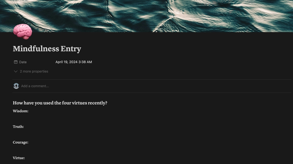 • Journal: Reflect on the prompts in the Daily Wisdom, Mindfulness, or Memento Mori journal templates. Or journal with a blank slate to clear your mind.